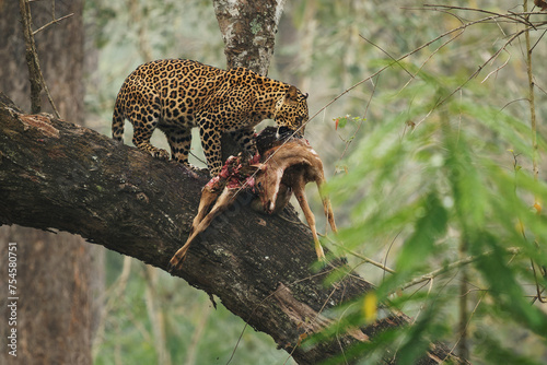 Leopard - Panthera pardus, big spotted yellow cat, male moving hunted prey on the tree branch , India or Africa, genus Panthera family Felidae, partly eaten corpus of the death preyin the jungle
