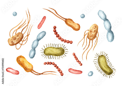 Beneficial prebiotic bacteria set. Watercolor hand drawn illustration, isolated on white background