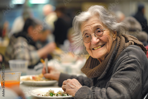Cheerful elderly homeless woman eats free meal in spacious dining hall. Old lady in need visits soup house to get food. Volunteer care of houseless