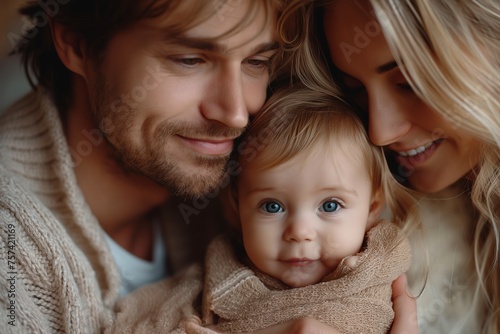 father and mother holding newborn baby, cherish and joyful smile, happy moment family portrait, Generative Ai