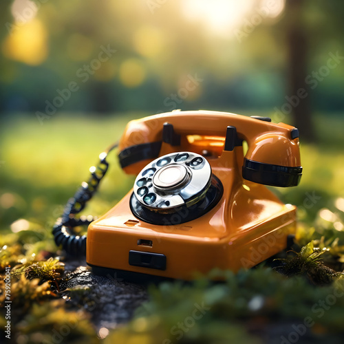 Macro shot, close up - tiny retro rotary telephone in nature in fresh morning atmosphere. Blur in the back.