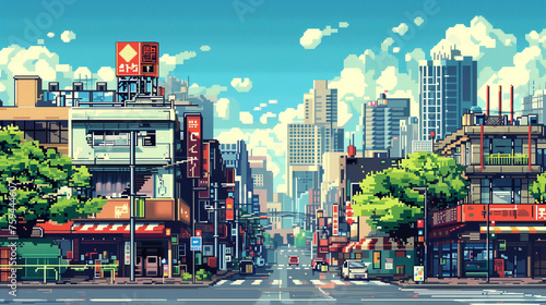 pixel art of city , side street with blue sky , 16 bit ,32 bit game art
