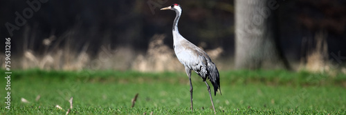 einzelner Kranich in Seitenansicht frei stehend auf leuchtend grüner Wiese vor dunklem Waldhintergrund im Frühling