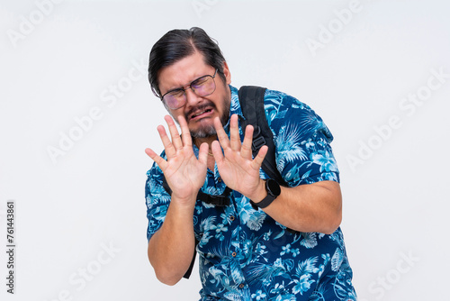 A cowardly middle-aged man in a Hawaiian shirt crying looking scared, pleading with hands up. Isolation on a white background conveys vulnerability. In trouble with the authorities in a foreign land.