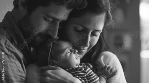 A family moment frozen in time as parents encompass their child in a heartfelt embrace, wrapped up in each other's love