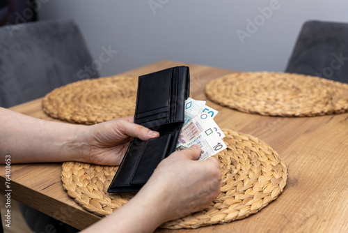 Mężczyzna liczący banknoty o nominałach 20, 50 oraz 10 złotych w portfelu. Koncepcję znaczących wydatków w porównaniu do poziomu wynagrodzenia, zwłaszcza w kontekście rosnących kosztów życia spowodowa