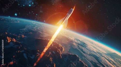 The artists rendering depicts a rocket taking off into space, with flames and smoke trailing behind.