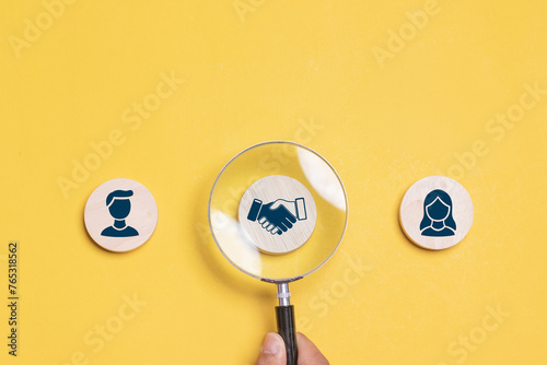 Mediation concept. Mediation between married couples, divorce and the role of the mediator. Wooden block with icon of woman and man and mediation.