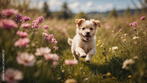 Adorable cachorro de perro corriendo feliz por un hermoso prado lleno de flores
