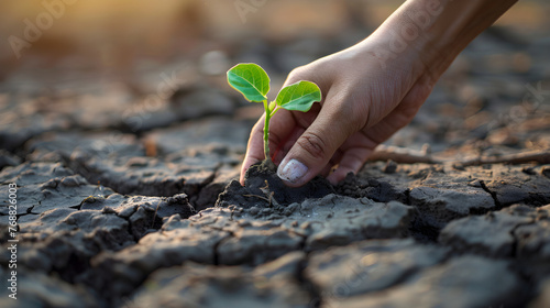 Human hand planting a single plant in a dry landscape, symbolizing hope for a greener future and inspiring actions to save the world.