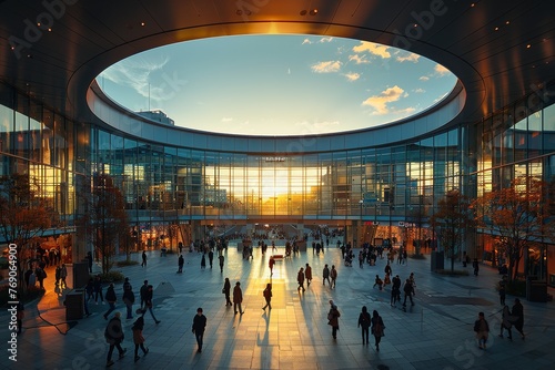 The golden hour sun casts a beautiful glow over a lively city plaza surrounded by modern architecture