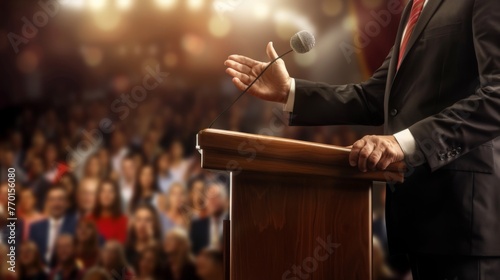 A politician speaks to an audience from the podium. Diplomatic speech, debate, demarche. Concept: Speechwriter, political activity and the will of voters.