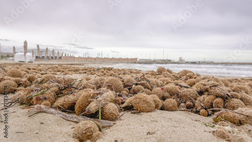 Bolas o pelotas de mar , formadas por las hojas de la posidonia muertas , playas de Alicante, Valencia, España