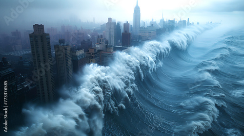 Enormous tsunami wave engulfing a city skyline in a dramatic environmental disaster.