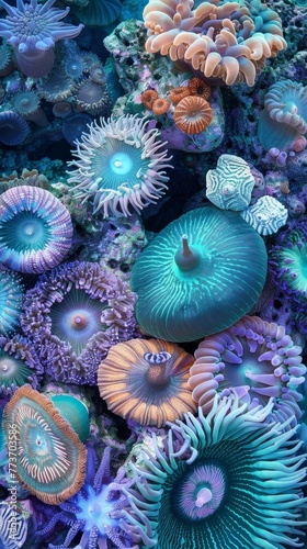 Vibrant marine anemones in underwater scenery. A beautiful and detailed image showcasing various colorful marine anemones, capturing the diversity of aquatic life