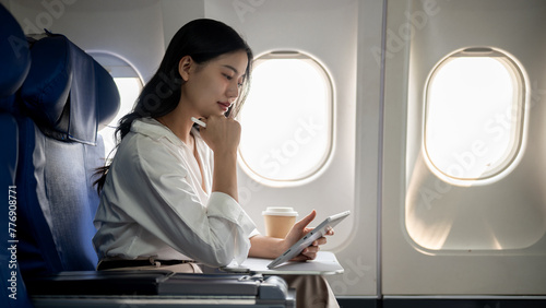 An attractive, hard-working Asian businesswoman is working on her tablet while traveling by plane.