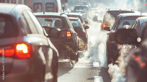 Cars release pollution into the air, exhaust gases. Car traffic jam on the road.