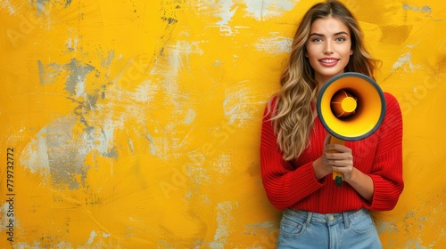 Young woman holding a megaphone, representing success and the positive concept and idea of marketing or sales.