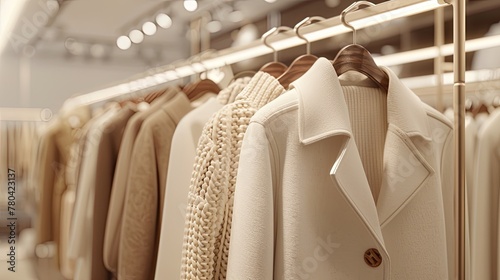A sophisticated display of a white-beige coat and sweater on hangers in a high-end fashion store. These classic pieces showcase timeless elegance in women's fashion.