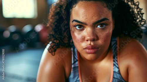 A young woman with curly hair freckles and striking eyes wearing a sports bra looking directly at the camera with a focused expression.