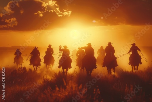 Silhouettes of cowboys riding horses at sunset in the Western plains
