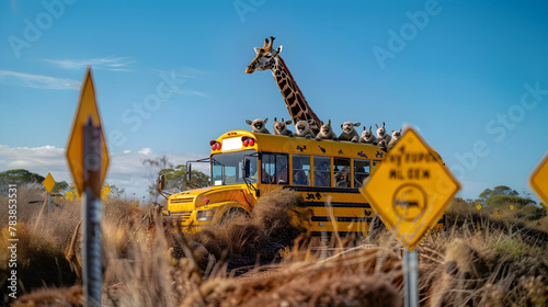 An Expedition Vehicle Transports a Curious Giraffe and Safari Explorers Through the Rugged African Wilderness Landscape