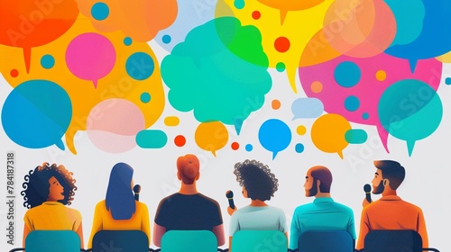 A diverse group of individuals engaging in conversation, showcasing social interaction and communication with vibrant speech bubbles.