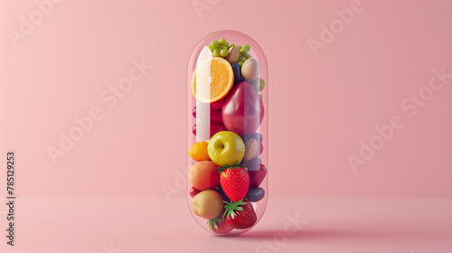 Script of multi-colored fruits, vegetables and nuts inside a capsule on a pink background. Conceptual print for healthy eating, vitamins or fitness.