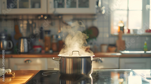 Boiling water on a fire, pot, pan, kettle, heat transfer concept, burner picture, simmering and boiling pan on fire, gas stove. Cozy bustling kitchen with steamer