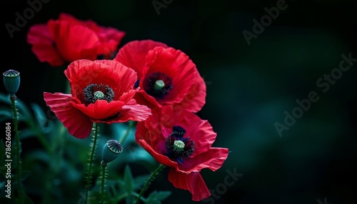 Symbolic red poppies on dark background significance for remembrance day, armistice day, anzac day