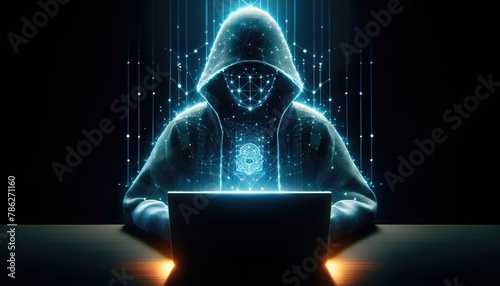 Mysterious hooded figure interacts with a laptop, surrounded by a complex web of glowing digital connections and lights.