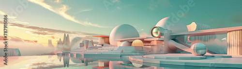 Pastel cityscape with rounded architecture, calm environment, surreal sky.