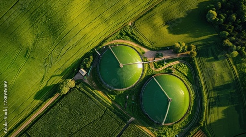 Aerial view over a green biogas storage tank. Biogas plants and farms in green fields Renewable energy from biomass modern agricultural concept