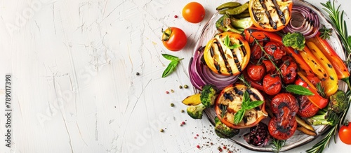 Bird's eye view of a vegetarian Mediterranean dish consisting of grilled fruits and vegetables placed on a white wooden picnic table with empty space for text.