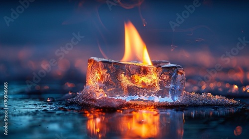 A large flame encased in a block of ice, representing the paradox of using highenergy processes in petrochemical production that contribute to global warming, yet are essential to current energy needs