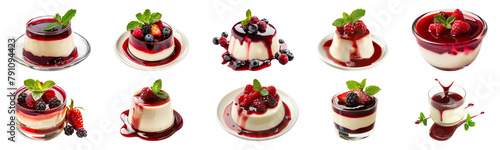 Elegant panna cotta with berry coulis and fresh fruits cut out png on transparent background