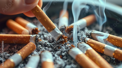Closeup of a cigarette in an ashtray, a hand reaching for one, various colors and shapes of cigarettes. Generative AI.