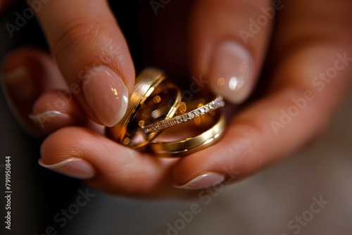 A stunning close-up image showcasing a pair of hands gently holding two shiny gold wedding bands, symbolizing love and marital commitment