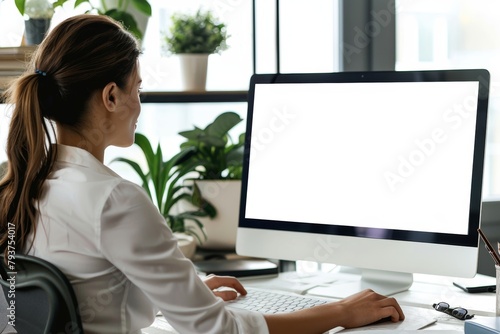 Digital mockup caucasian woman in her 40s in front of a computer with a completely white screen