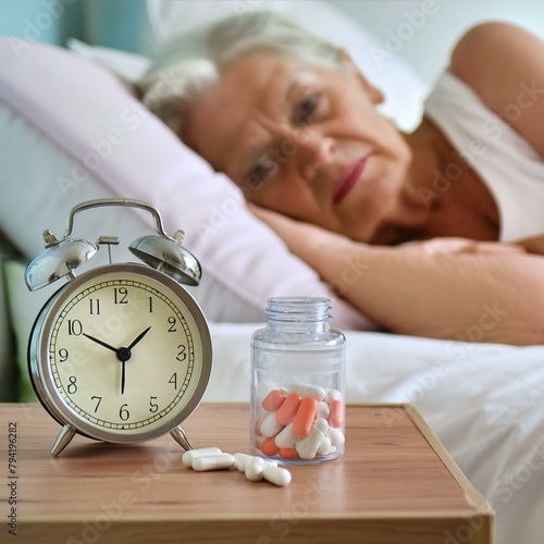 Kobieta leżąca w łóżku i usiłująca zasnąć. Obok łóżka tabletki i zegar. Bezsenność, kłopoty ze snem, leki nasenne, depresja, dobrostan psychiczny, zależność pomiędzy lekami a snem