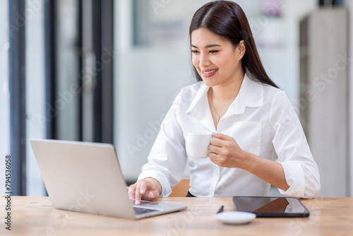 Asian Business woman using calculator and laptop for doing math finance on an office desk, tax, report, accounting, statistics, and analytical research concept