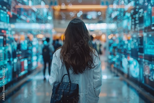 A woman is seen from behind, walking through a modern digital mall with vibrant displays, reflecting a futuristic shopping experience