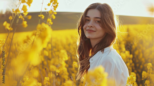 Dziewczyna z długimi włosami w polu rzepaku