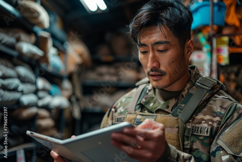 A soldier in camouflage uniform is intently reviewing information on a digital tablet amidst military gear in a storeroom