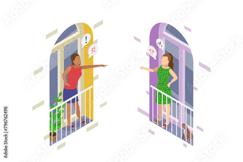 3D Isometric Flat Illustration of Furious Female Neighbors, Conflict Between Residents of a Building