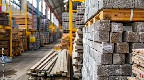 Construction Materials Warehouse, Ideal for companies in construction material production and sales. Background shows stacks of bricks, concrete blocks, and timber, Generative AI.