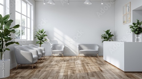 doctor's office waiting room with a white wall, some soft gray chairs, oak flooring
