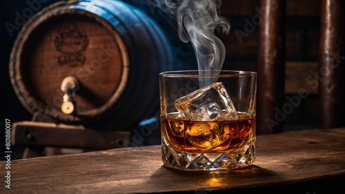 Glass of whiskey with ice, on a wooden table