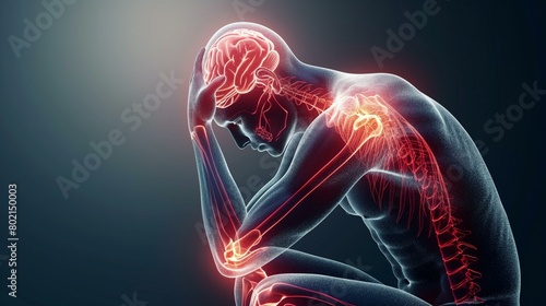 Joint pain, man with painful neck and back pain, healthy lifestyle exercising physiology human muscle body conscious