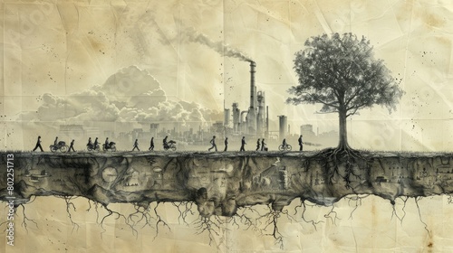 A drawing of people walking on a path that is made of the roots of a tree, with a factory in the background.